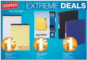 Just so everyone knows, on the Staples deals – you cannot get the items that are .01 with a $5 purchase if all of your items are Extreme Deals. So any of the .25, free after rebate, etc. are considered extreme deals.